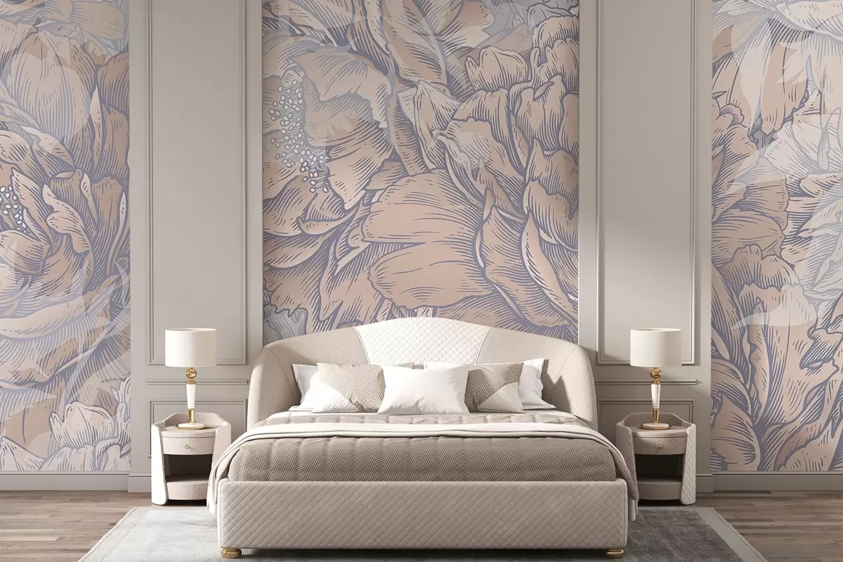 Фототапет Цветове на божур с подробни венчелистчета и тичинки, меки пастелни цветове, винтидж ботанически стил на илюстрация Nr w08890