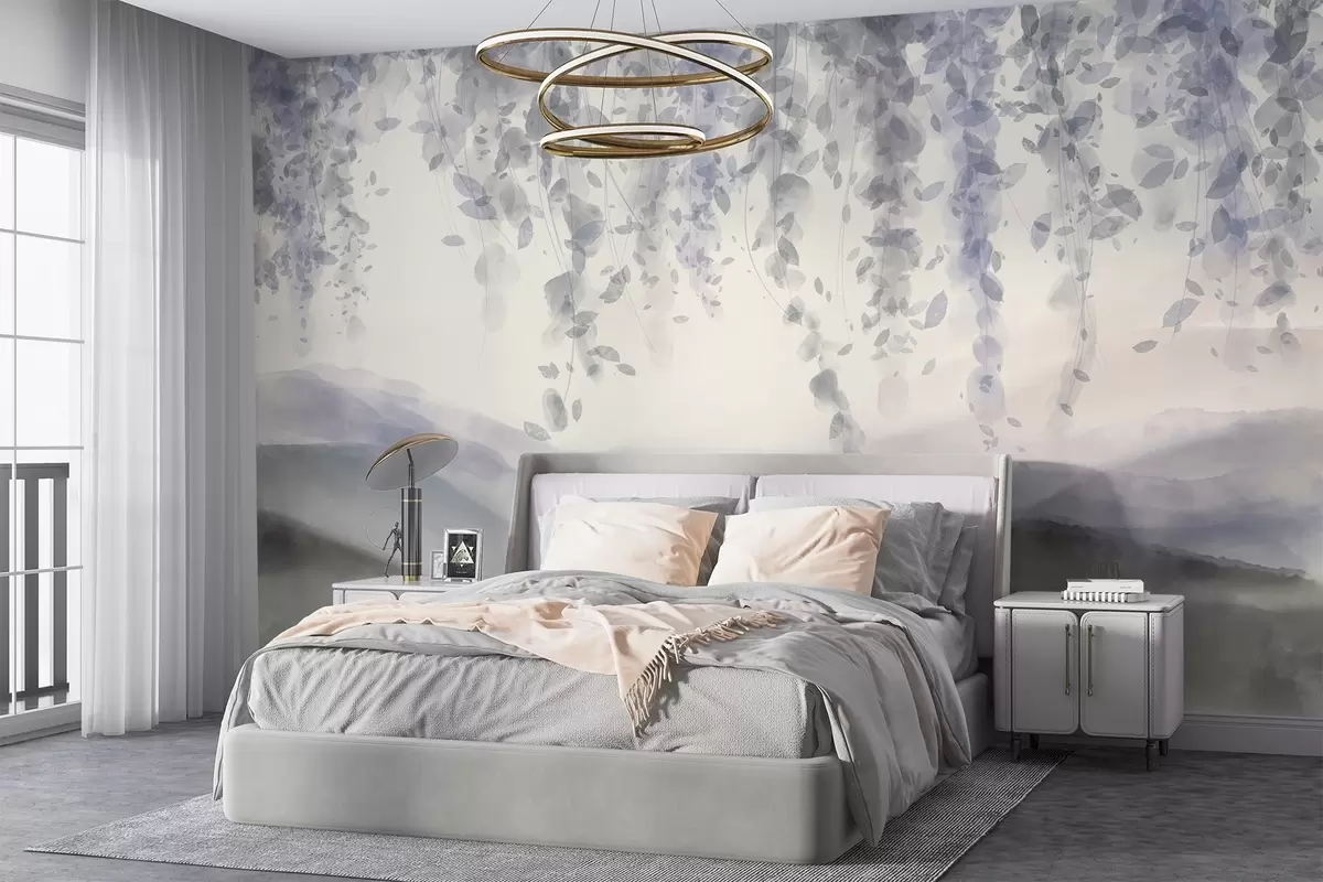 Фототапет Листата на глицинията висят над сините планини, меки пастелни сини и сиви цветове, пейзаж в акварелен стил w08909
