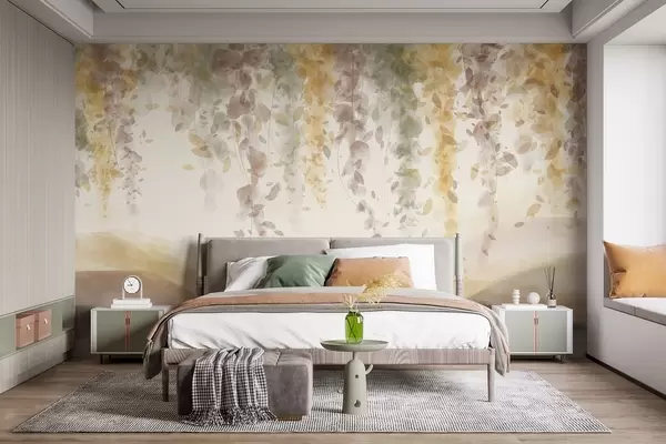 Фототапет Листата на глицинията висят над сините планини, меки пастелни жълти и кафяви цветове, пейзаж в акварелен стил Nr w08909v1