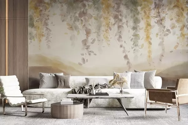 Фототапет Листата на глицинията висят над сините планини, меки пастелни жълти и кафяви цветове, пейзаж в акварелен стил Nr w08909v1
