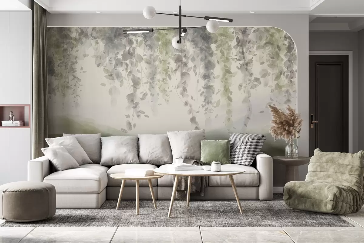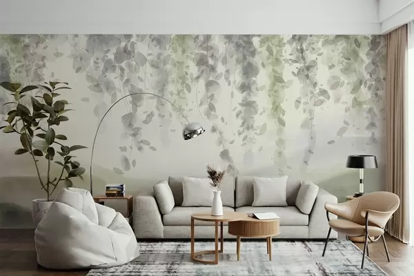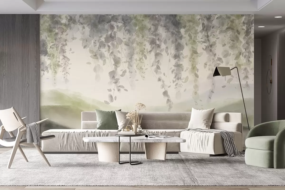 Фототапет Листата на глицинията висят над сините планини, меки пастелни зелени и бежови цветове, пейзаж в акварелен стил Nr w08909v2