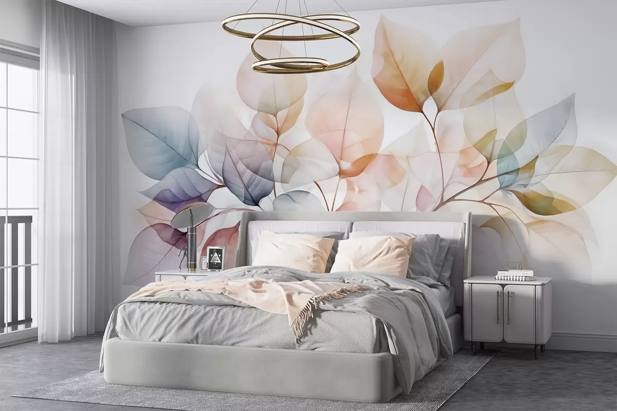 Фототапет Акварелна картина на полупрозрачни листа в пастелни цветове с нюанси на розово, бяло, лилаво и синьо Nr w08910