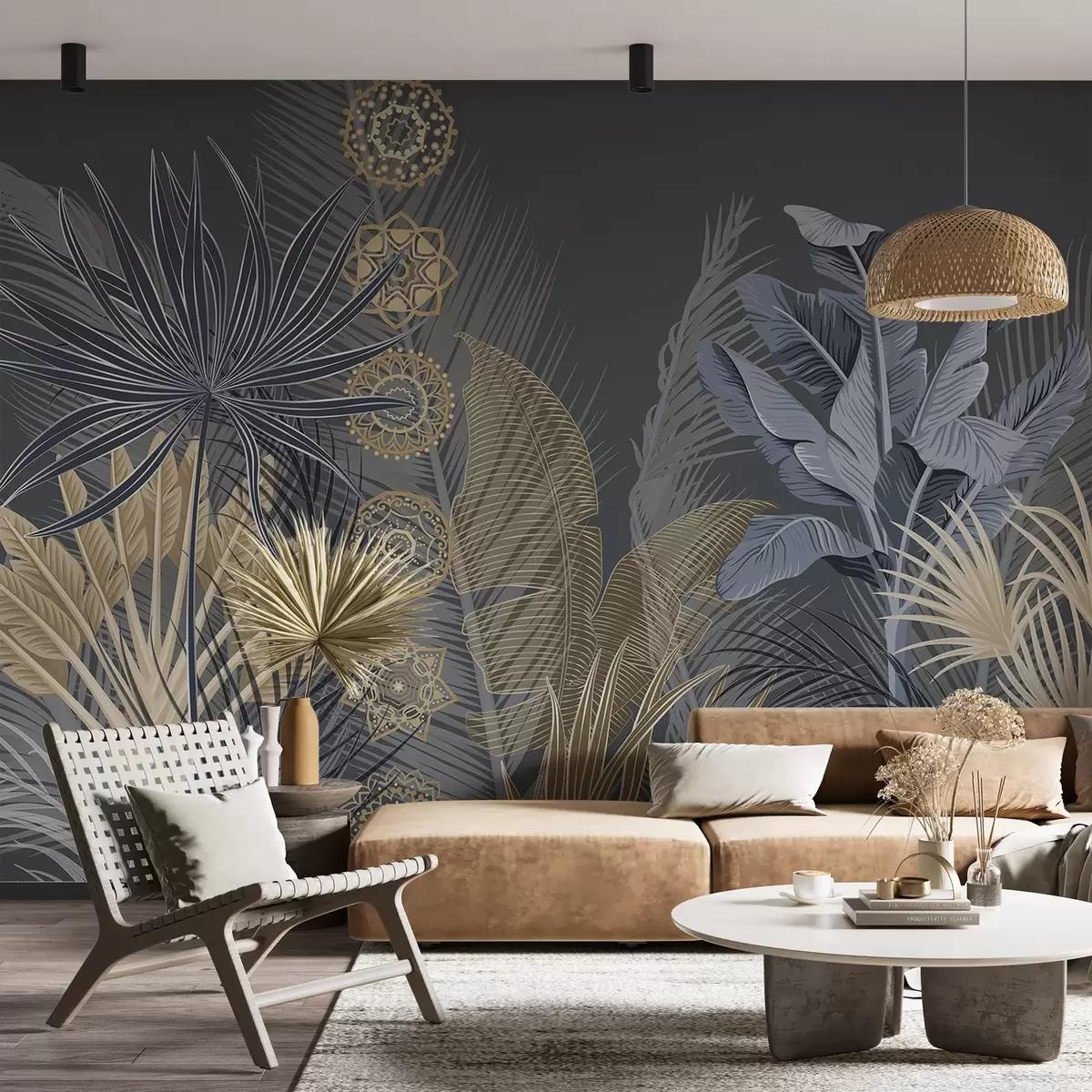 Фототапет Тропически листа в сини и кафяви тонове, палмови листа, бананови листа и мандала орнаменти, тъмен фон Nr w08913