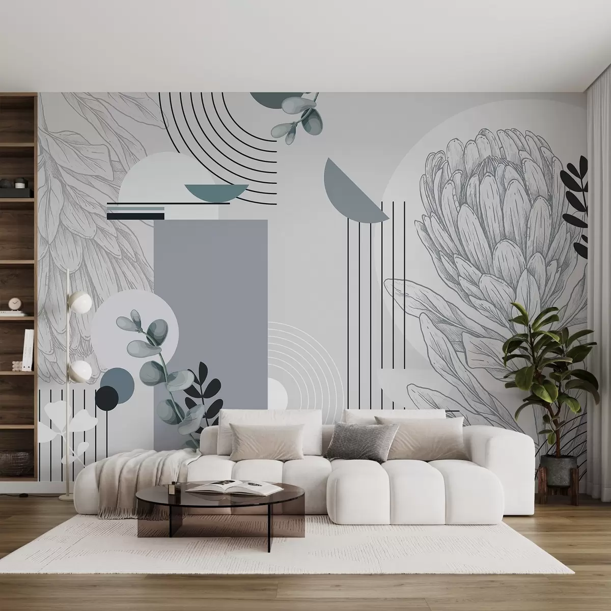 Фототапет Абстрактен ботанически принт с цвете протея, листа от евкалипт, геометрични форми в минималистичен стил, пастелни цветове Nr w08914v1