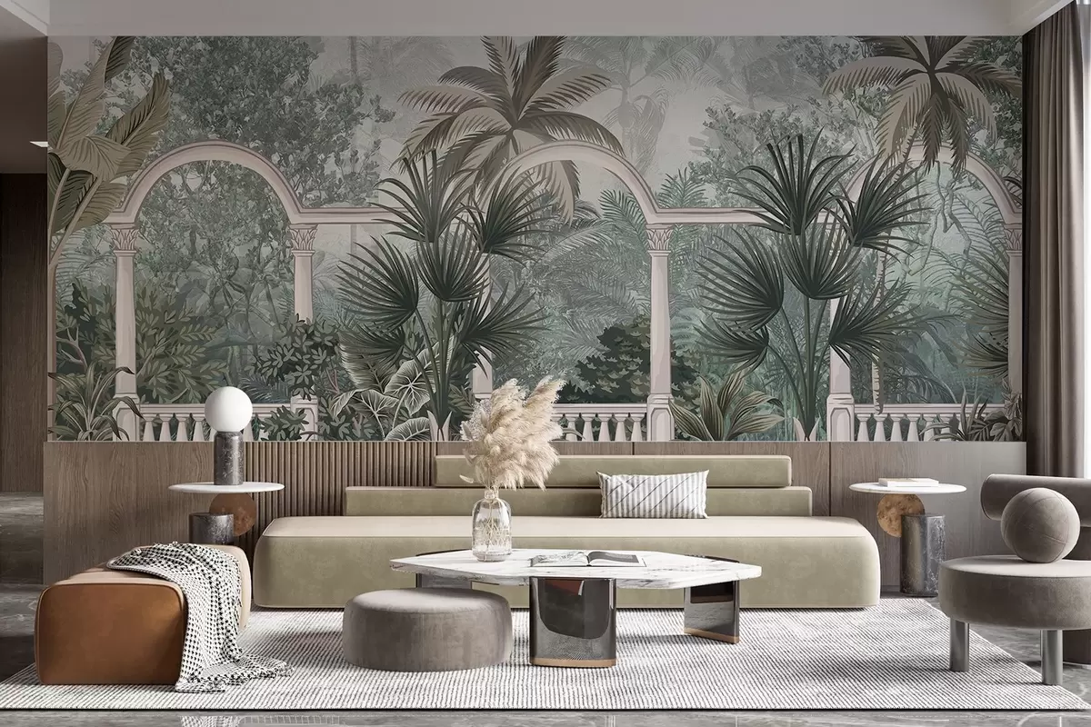 Фототапет Тропическа градина с палми и буйна растителност, балюстрада с арки, приглушени цветове, винтидж стил Nr w08916