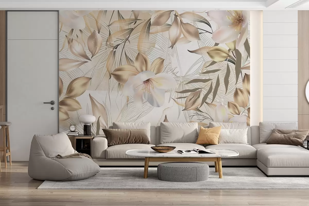 Фототапет Цветя и листа от жасмин, меки цветове, ботаническа илюстрация, цветен фон , елегантен дизайн, деликатни венчелистчета Nr w08977