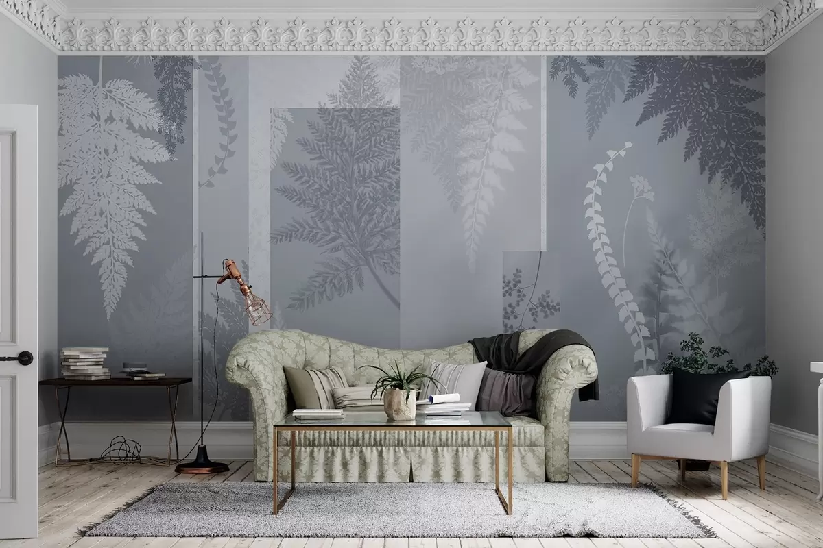 Фототапет Листа от папрат в синьо и бяло, подредени на вертикални ивици, създаващи ботанически и минималистичен принт, меки и приглушени цветове Nr w09007v1