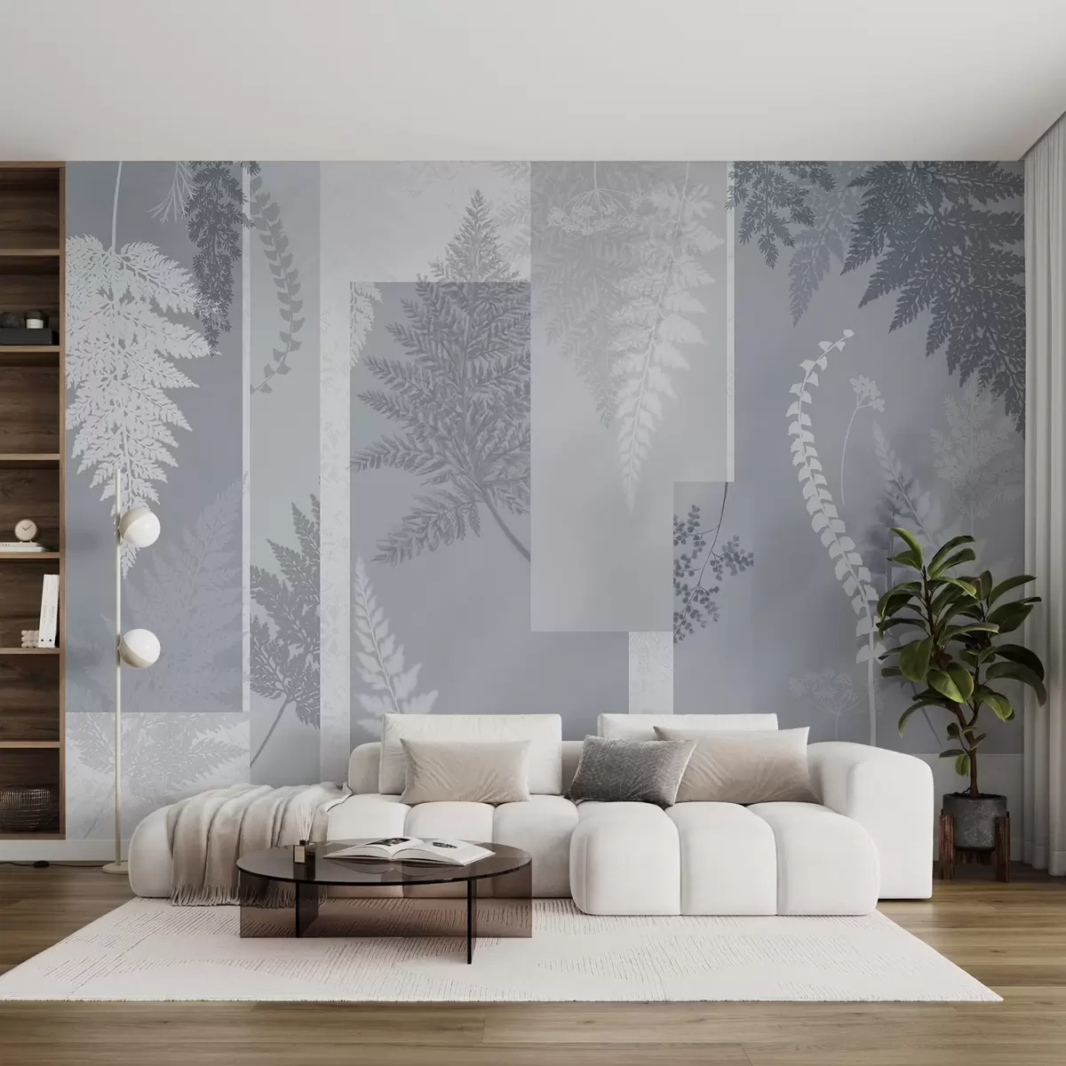 Фототапет Листа от папрат в синьо и бяло, подредени на вертикални ивици, създаващи ботанически и минималистичен принт, меки и приглушени цветове Nr w09007v1