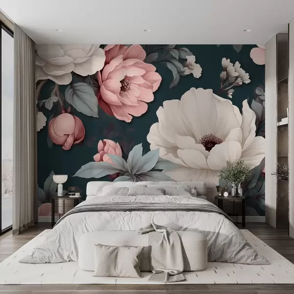 Фототапет Бели и розови божури на тъмносин фон Nr w09017
