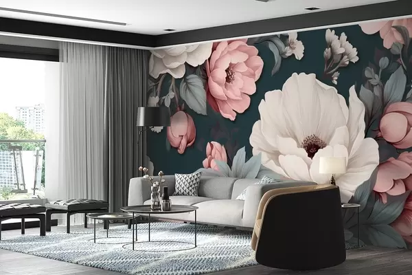 Фототапет Бели и розови божури на тъмносин фон Nr w09017