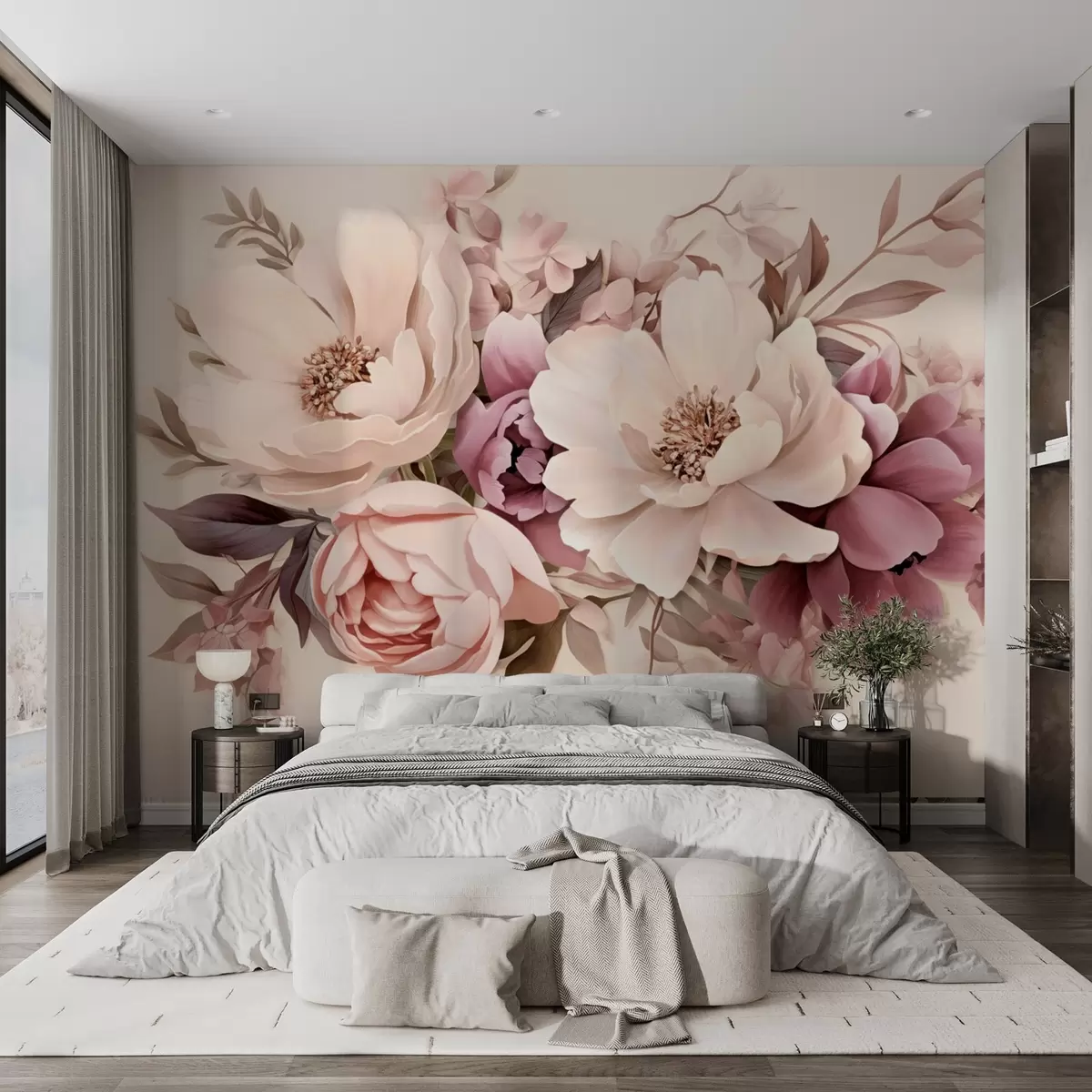 Фототапет Деликатна композиция от розови и бежови цветя, божури с листа Nr w09019