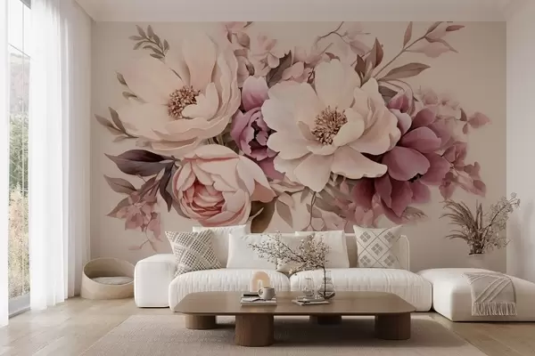 Фототапет Деликатна композиция от розови и бежови цветя, божури с листа Nr w09019