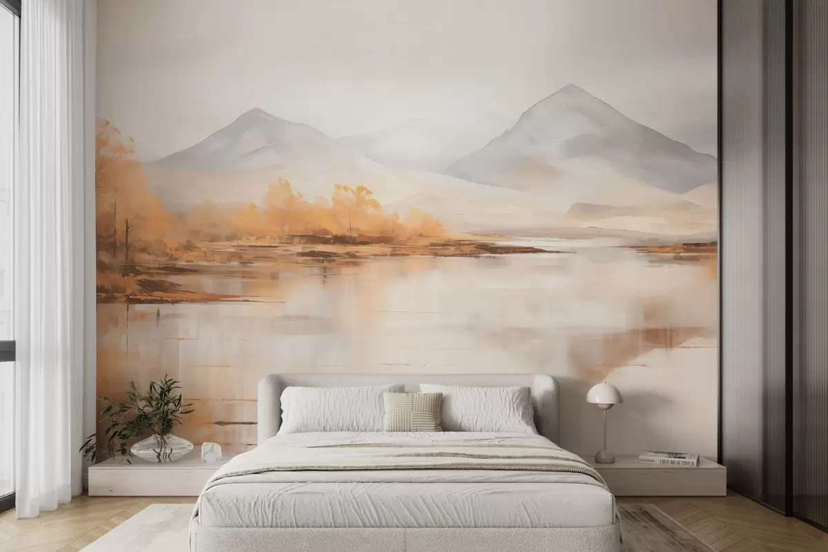 Фототапет Есенен пейзаж с жълти дървета и река на фона на планина Nr w09020