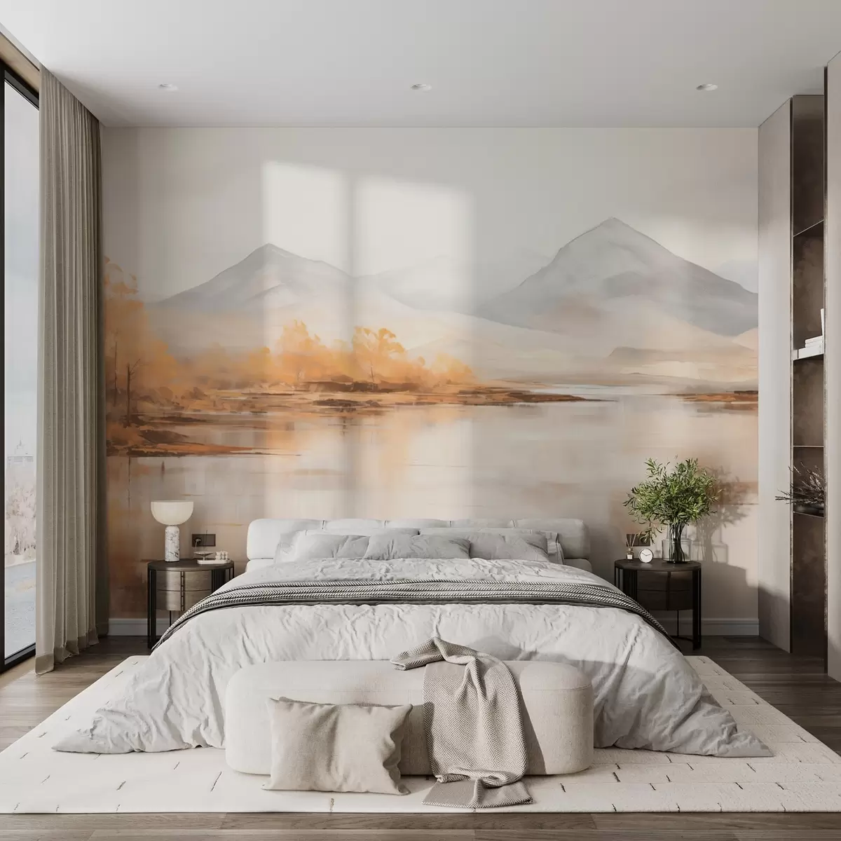 Фототапет Есенен пейзаж с жълти дървета и река на фона на планина Nr w09020