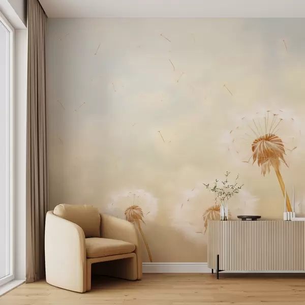 Фототапет Ефирни бежови глухарчета, които се веят от вятъра на фона на небето Nr w09028