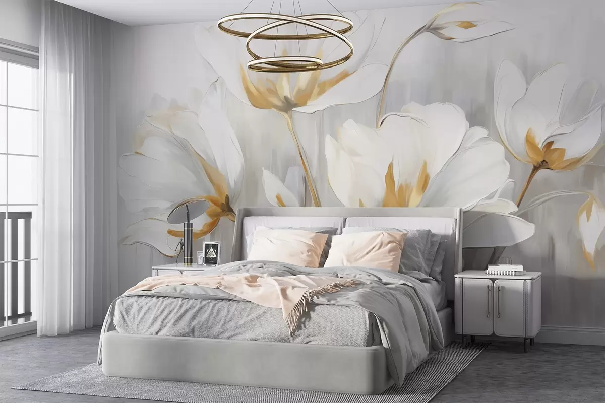 Фототапет Бели абстрактни цветя с бели венчелистчета и стъбла на сив фон със сиви и бели вертикални щрихи на четката Nr w09047
