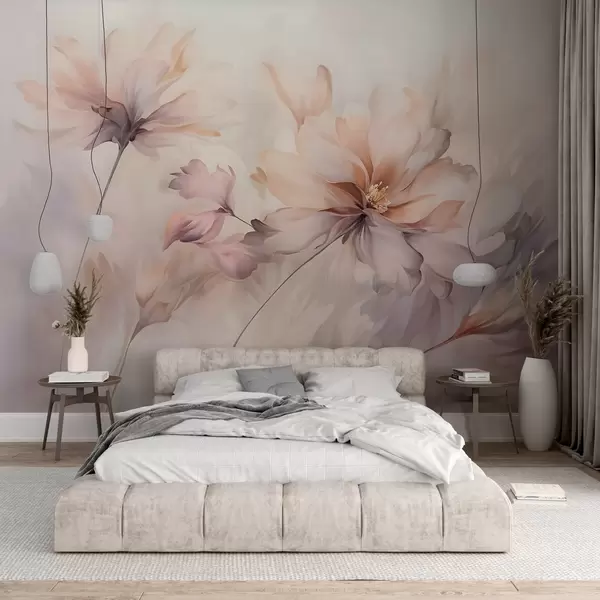 Фототапет Деликатно флорално изкуство с големи цветя в пастелни цветове с полупрозрачни венчелистчета, меки стъбла и нежен дифузен фон Nr w09050