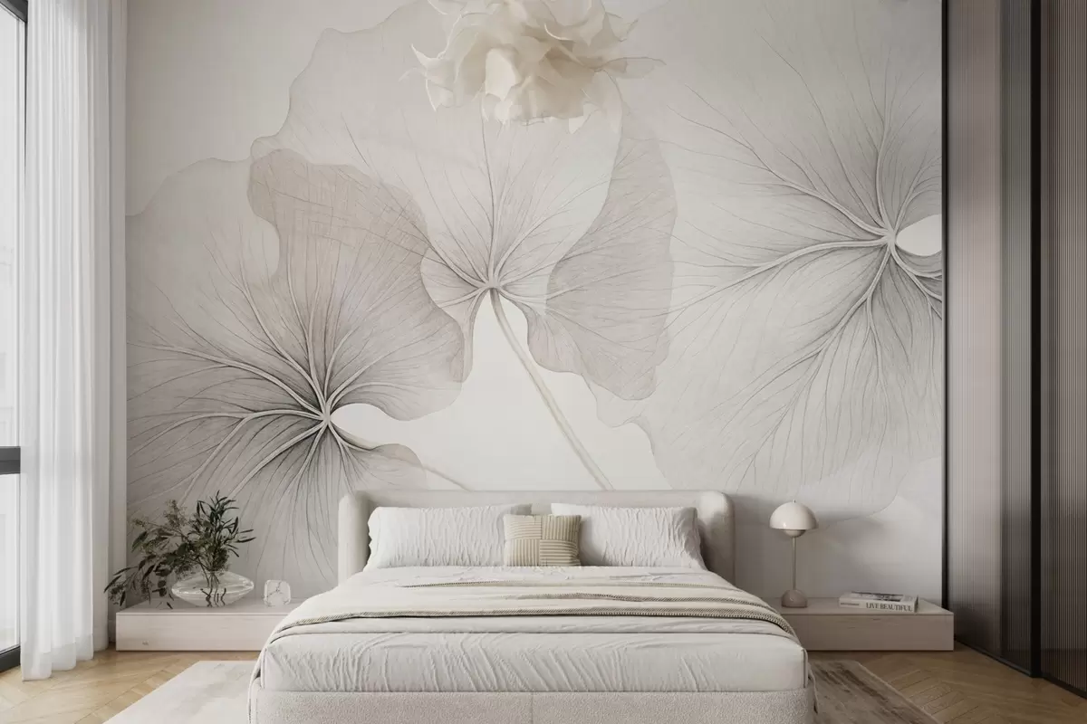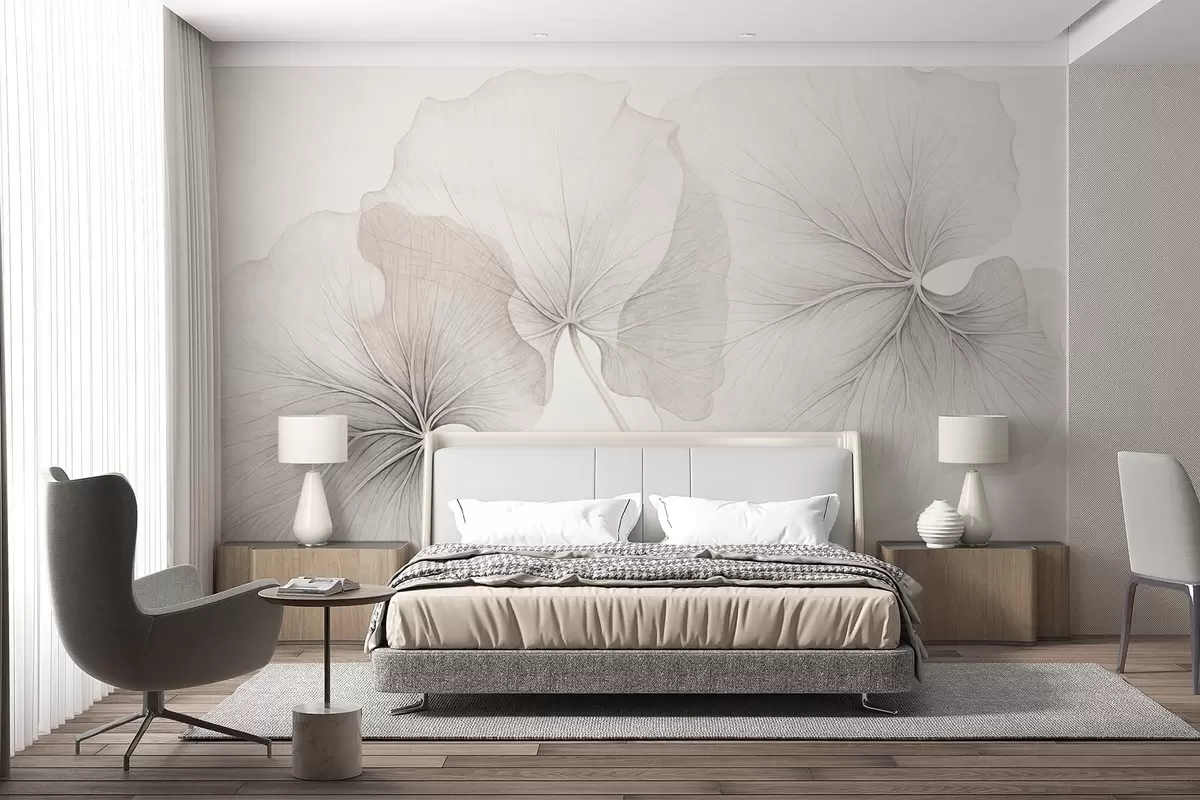 Фототапет Три полупрозрачни листа с видими жилки, с шумяща текстура, леко припокриващи се, с тънки стъбла на бял фон Nr w09052