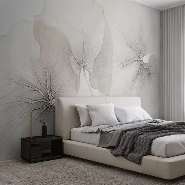 Фототапет Три полупрозрачни листа с видими жилки, с шумяща текстура, леко припокриващи се, с тънки стъбла на бял фон Nr w09052