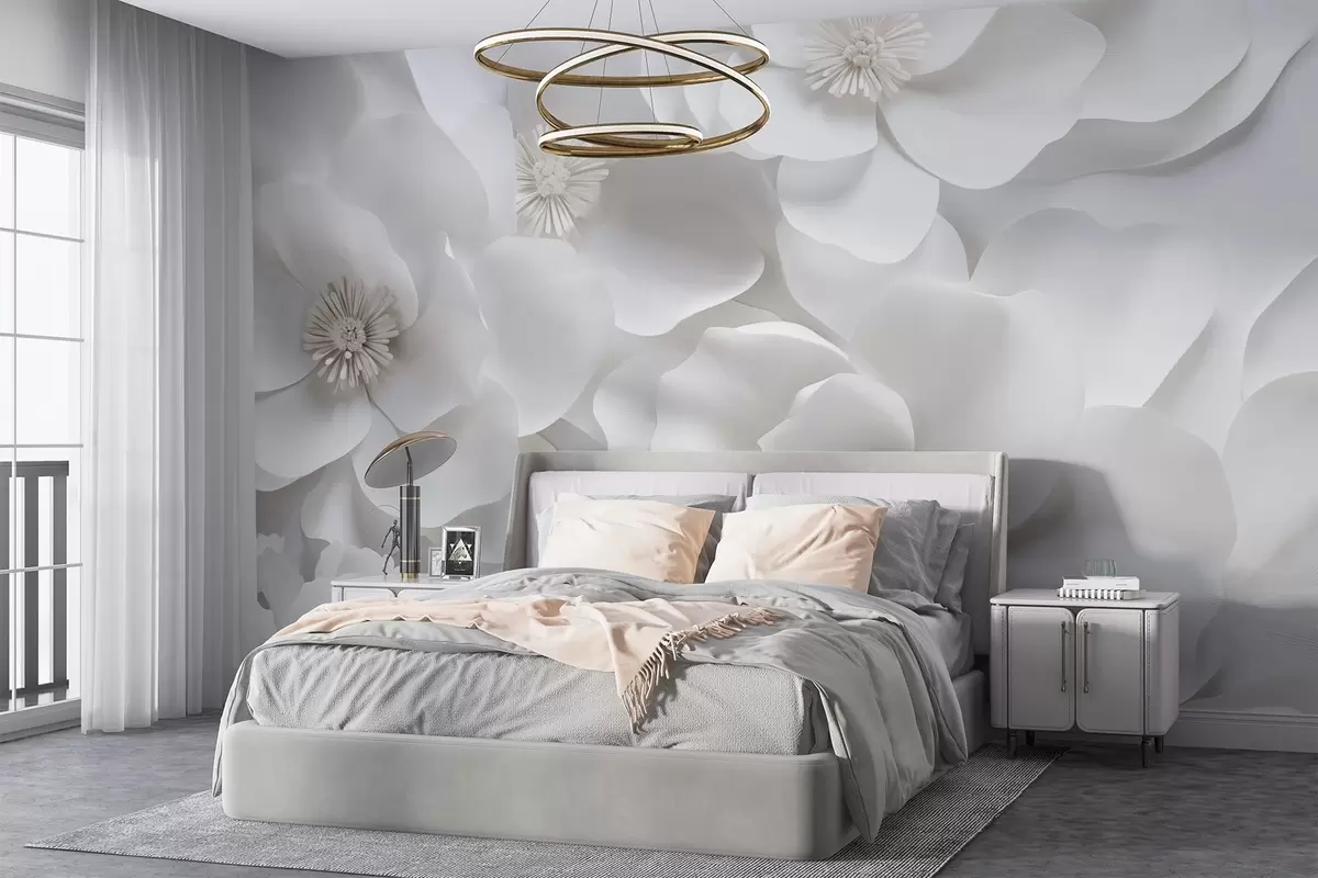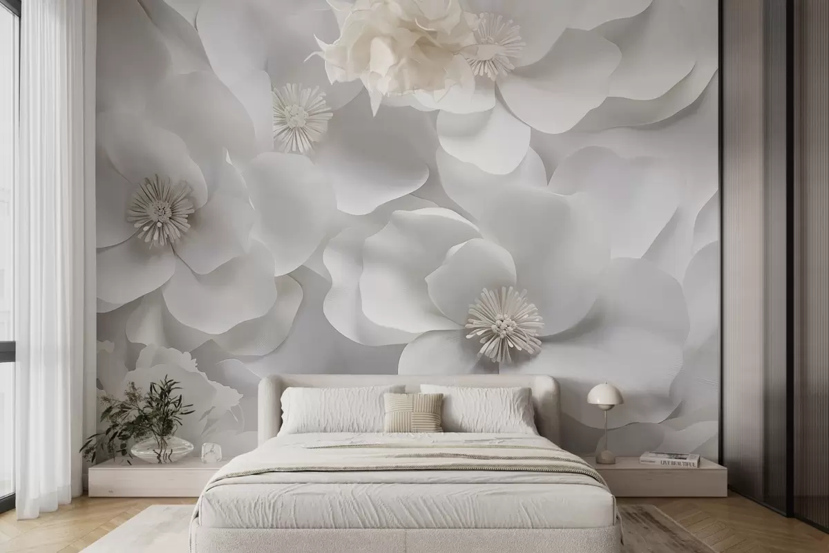 Фототапет Бели цветя с деликатни венчелистчета, подредени в плътен грозд, създаващи усещане за чистота и елегантност на бял фон Nr w09053