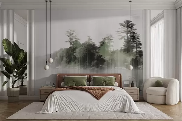 Фототапет Абстрактен минималистичен текстуриран пейзаж с езеро и отражения на дървета във водата в зелени и бели нюанси Nr w09058