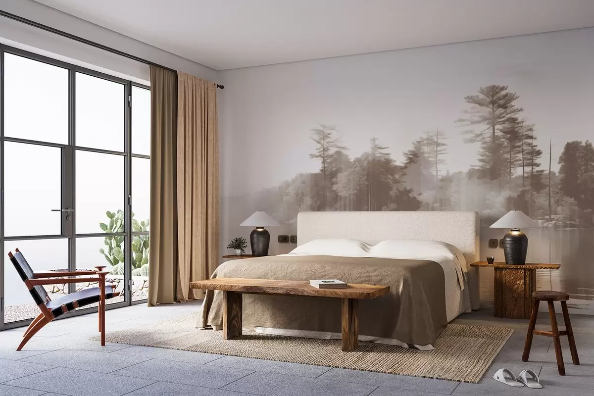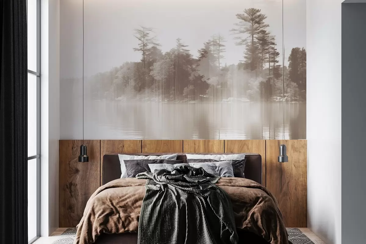 Фототапет Абстрактен минималистичен текстуриран пейзаж с езеро и отражения на дървета във водата в бежови и бели нюанси Nr w09058v1