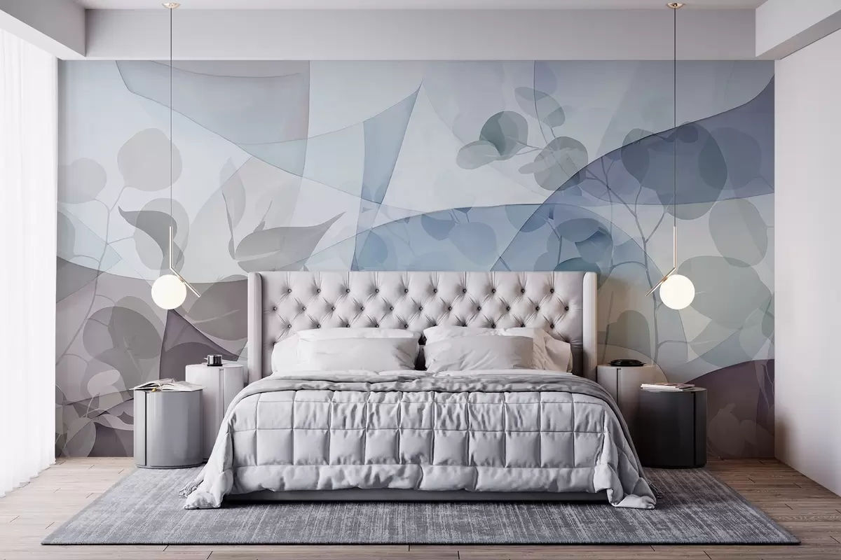 Фототапет Абстрактна ботаническа илюстрация с листа от евкалипт и геометрични форми в меки приглушени цветове - синьо, кафяво и бяло Nr w09061