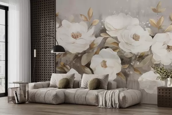 Фототапет Бели цветя с жълти листа, меки венчелистчета, деликатна флорална композиция, неутрална цветова палитра, текстурирани движения на четката Nr w09062