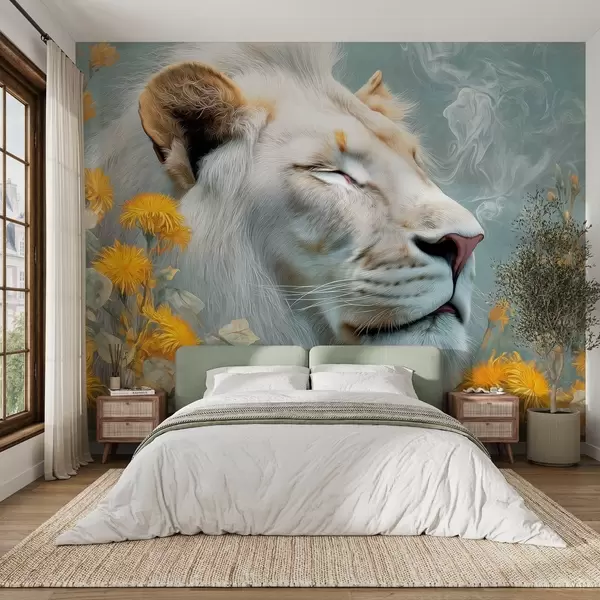 Фототапет Бял лъв, заобиколен от жълти цветя и дим Nr w09080