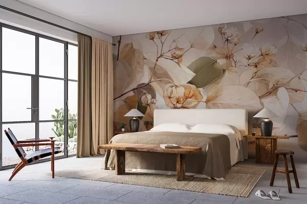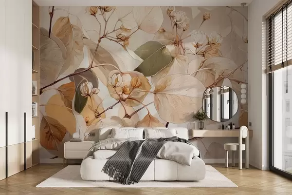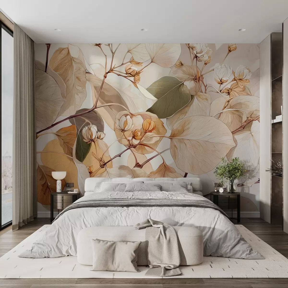 Фототапет Клони от листа и цветя на трепетлика в стил маслена живопис в бежови тонове Nr w09082