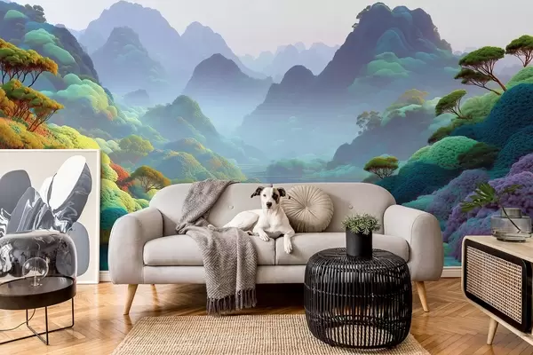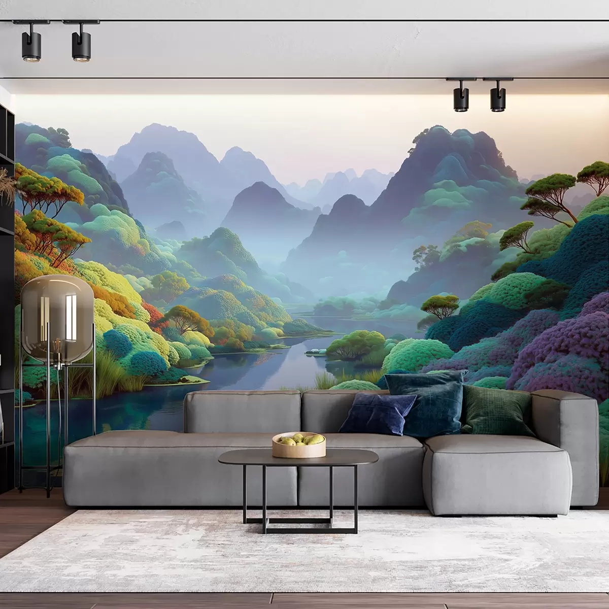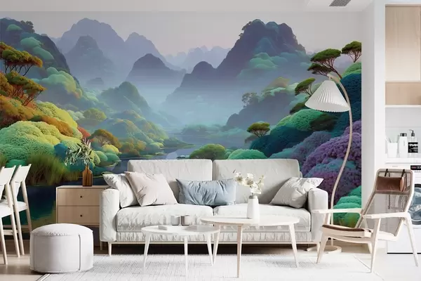 Фототапет Планински пейзаж с река в сини тонове с дървета и храсти Nr w09088