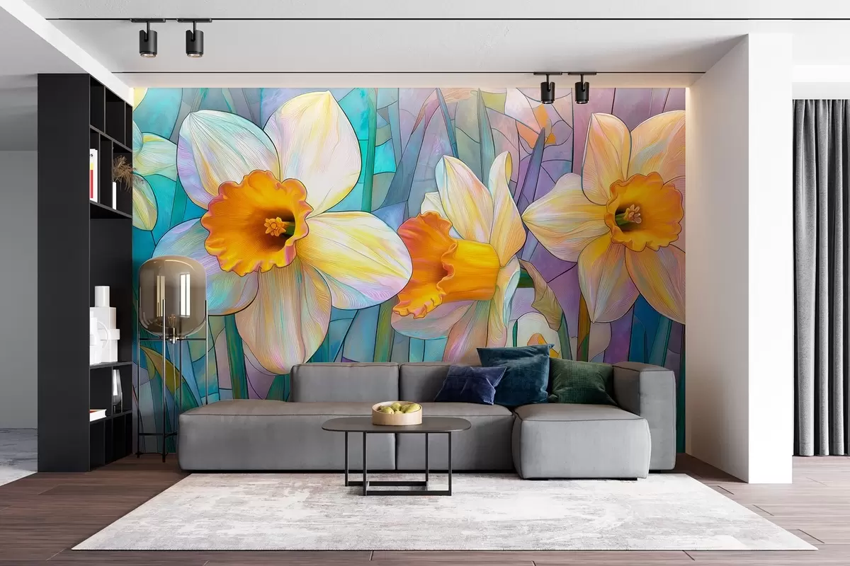 Фототапет Цветни нарциси на синьо-виолетов витражен фон Nr w09092