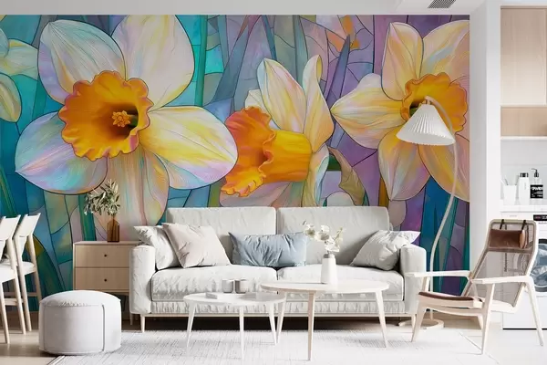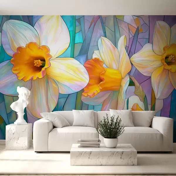Фототапет Цветни нарциси на синьо-виолетов витражен фон Nr w09092