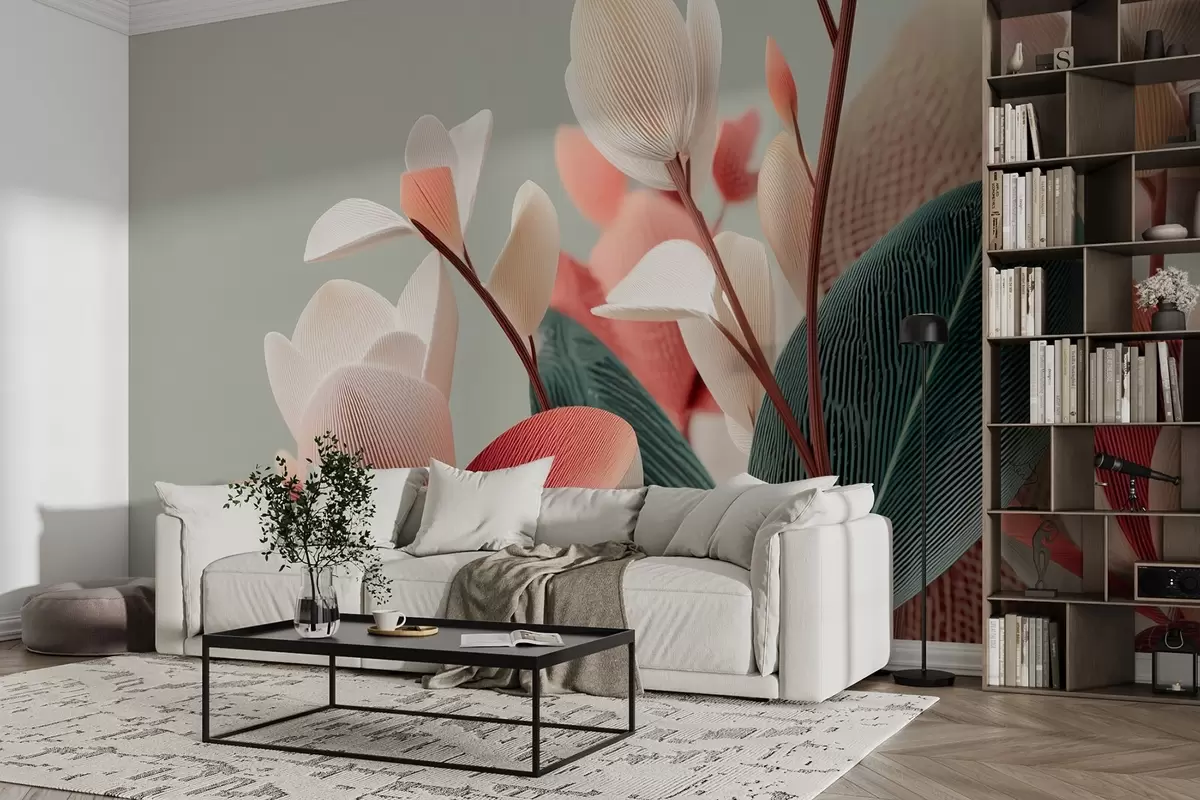 Фототапет Текстурирани цветя и листа в пастелни и зелени тонове Nr w09094