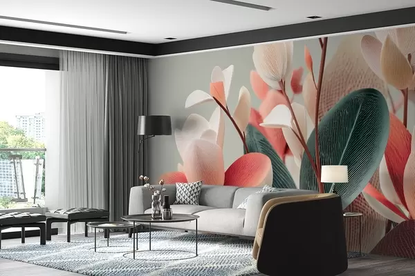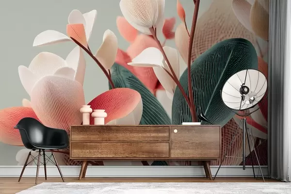 Фототапет Текстурирани цветя и листа в пастелни и зелени тонове Nr w09094