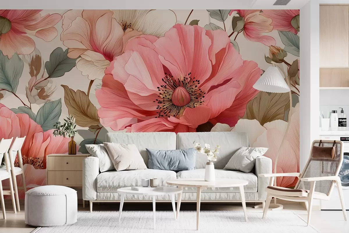 Фототапет Деликатни макове с листа в червено-розови нюанси Nr w09100
