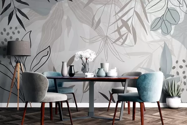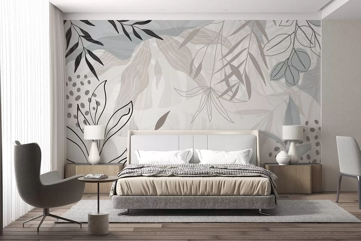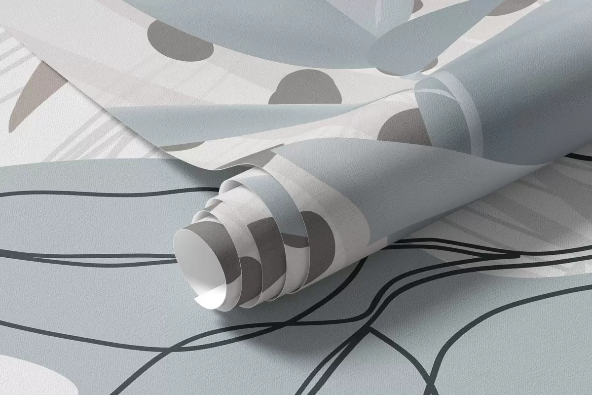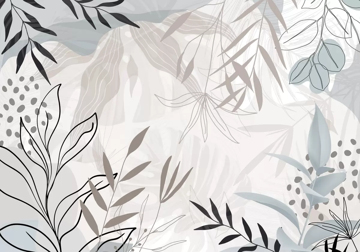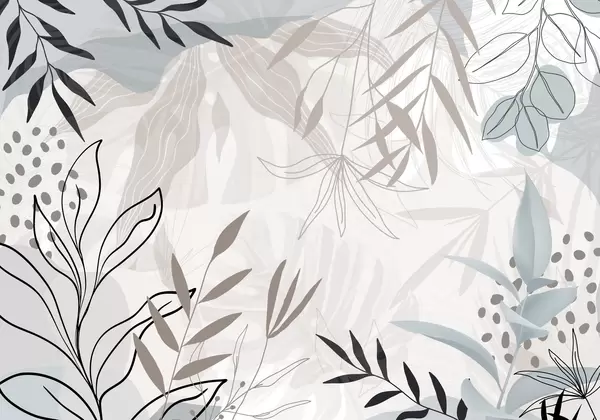Фототапет Абстрактен цветен модерен дизайн с пастелни бежови, сиви, сини и черни листа, деликатни линии и мек фон Nr w09105