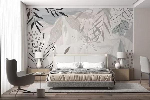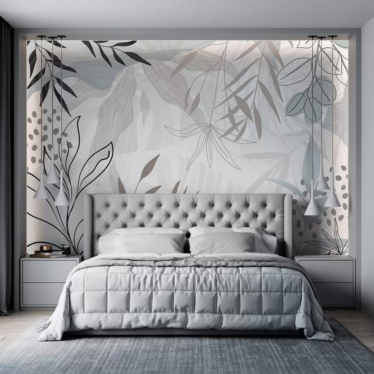 Фототапет Абстрактен цветен модерен дизайн с пастелни бежови, сиви, сини и черни листа, деликатни линии и мек фон Nr w09105