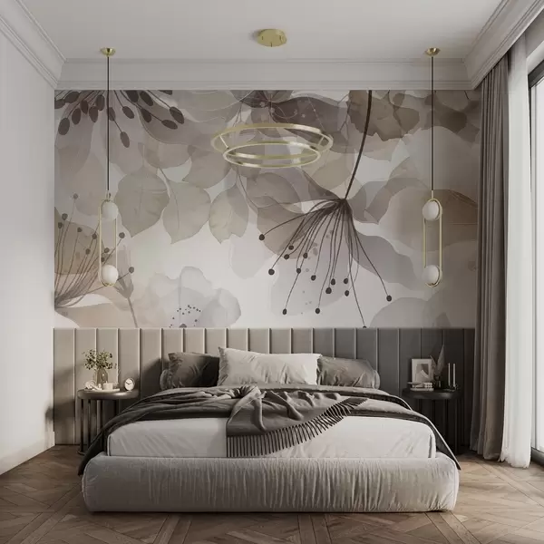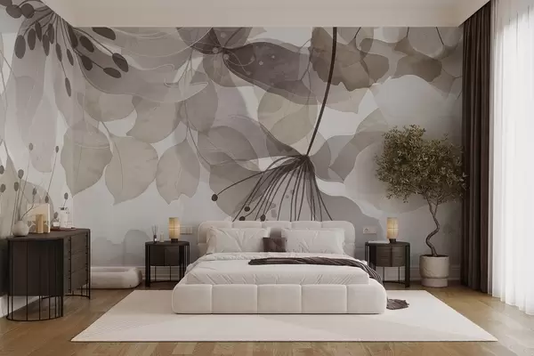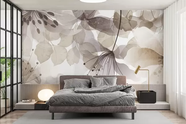 Фототапет Цветя и листа в бежови цветове, полупрозрачни венчелистчета и листа, мек акварелен ефект, деликатни линии, бял фон Nr w09107v1