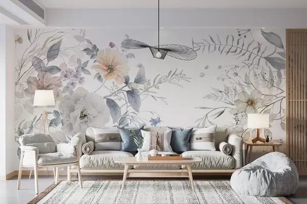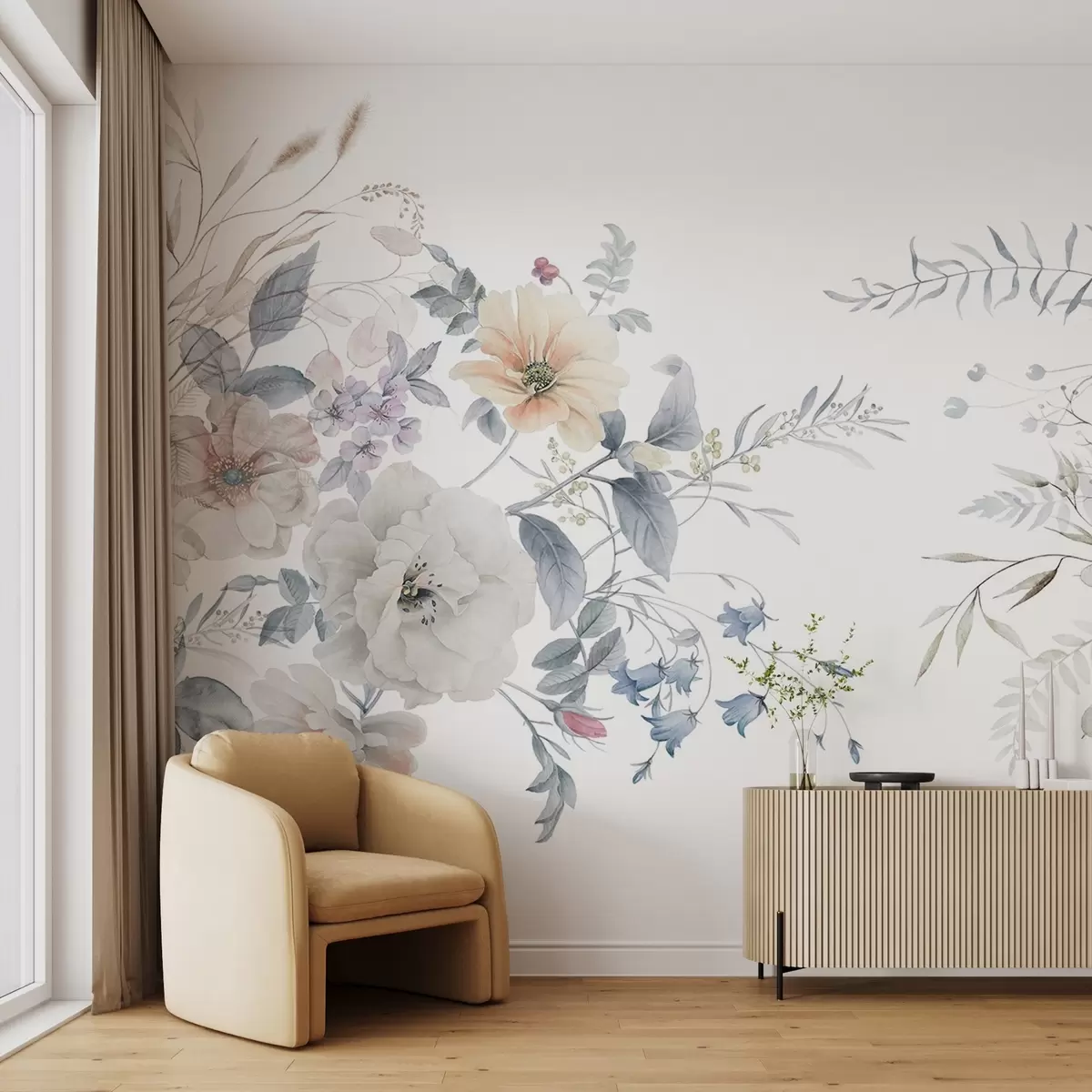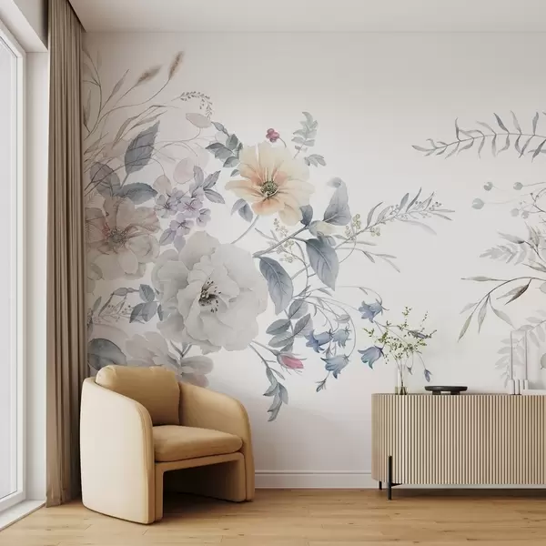 Фототапет Цветна композиция в стил акварел с бели, прасковени и сини цветя, деликатна зеленина на бял фон Nr w09108