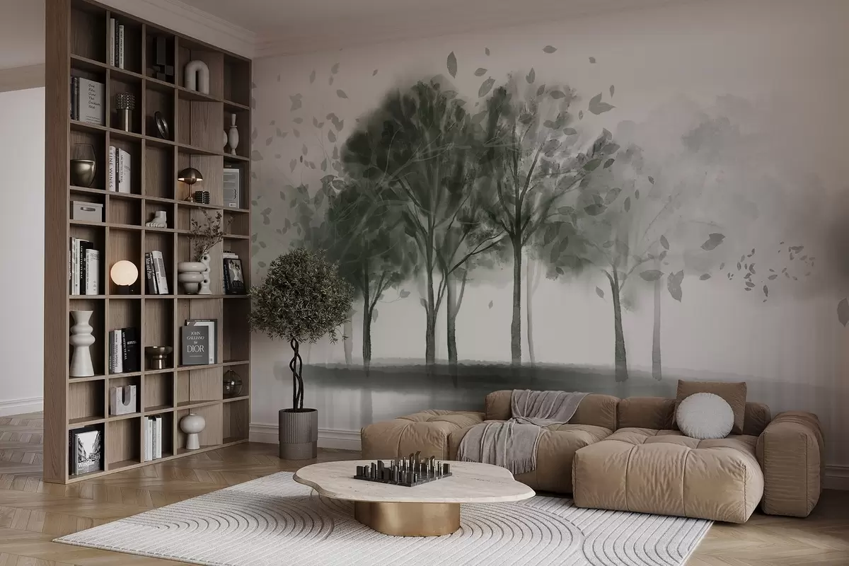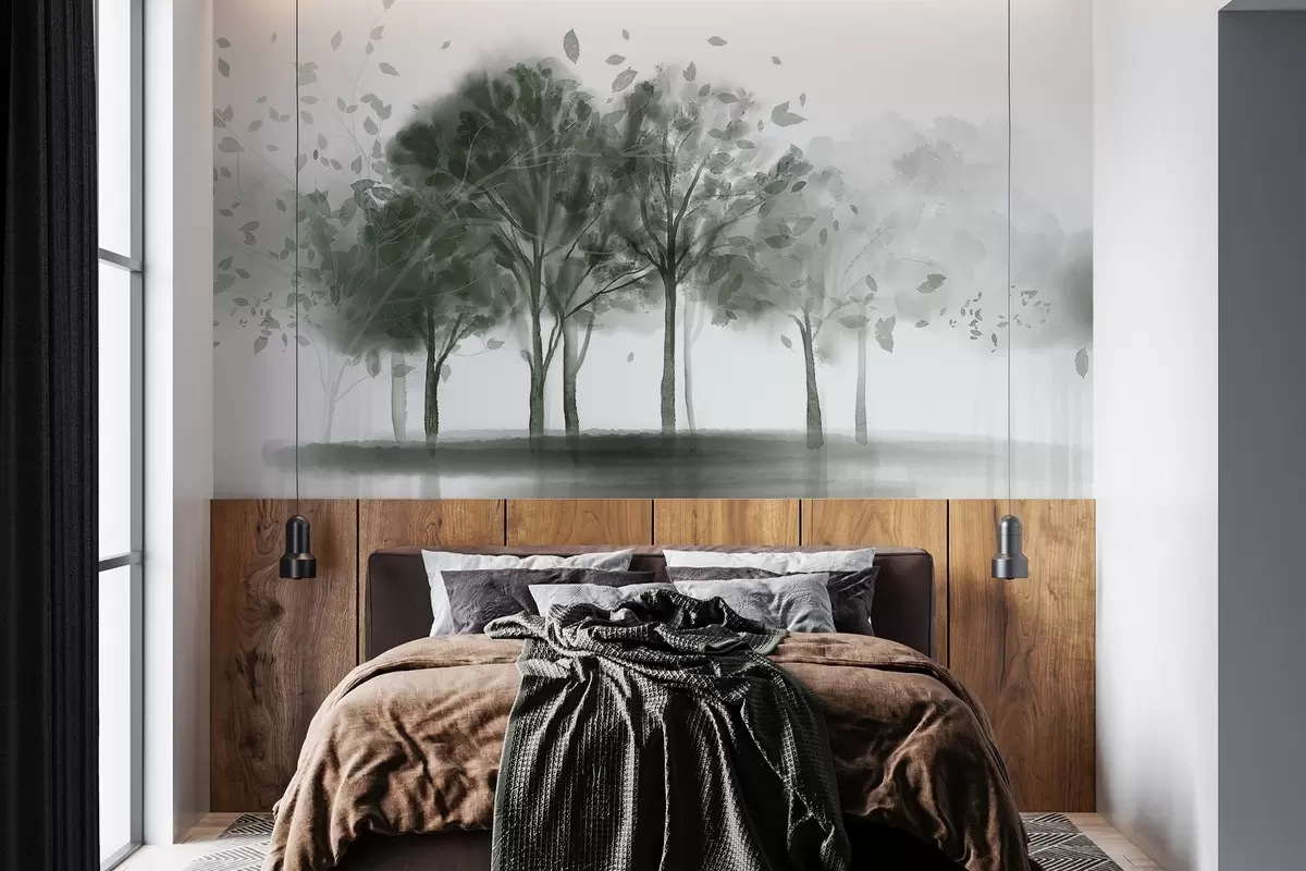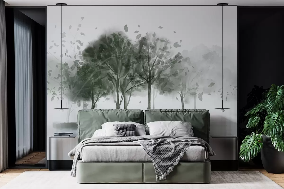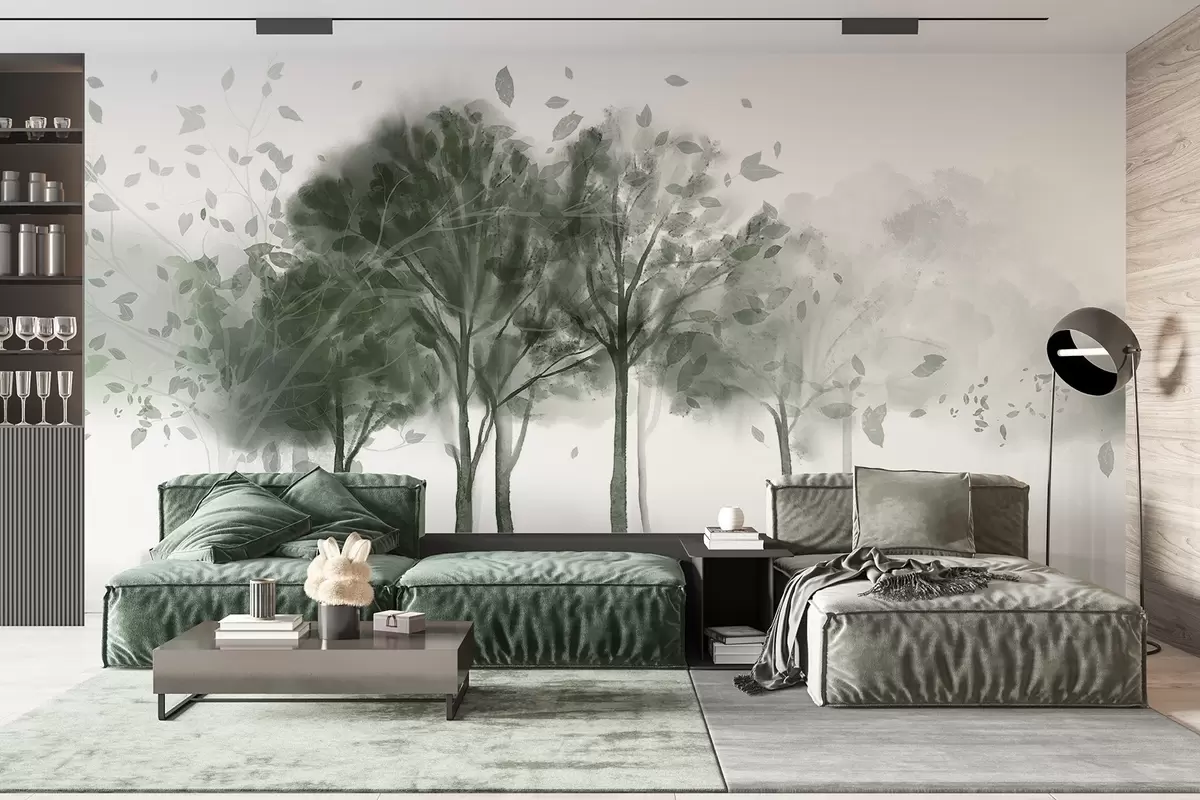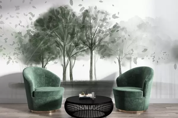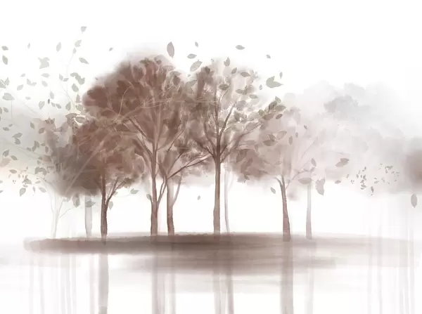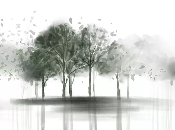 Фототапет Абстрактен пейзаж с дървета със зелени листа, отразяващи се във водата, в акварелен текстуриран стил Nr w09109
