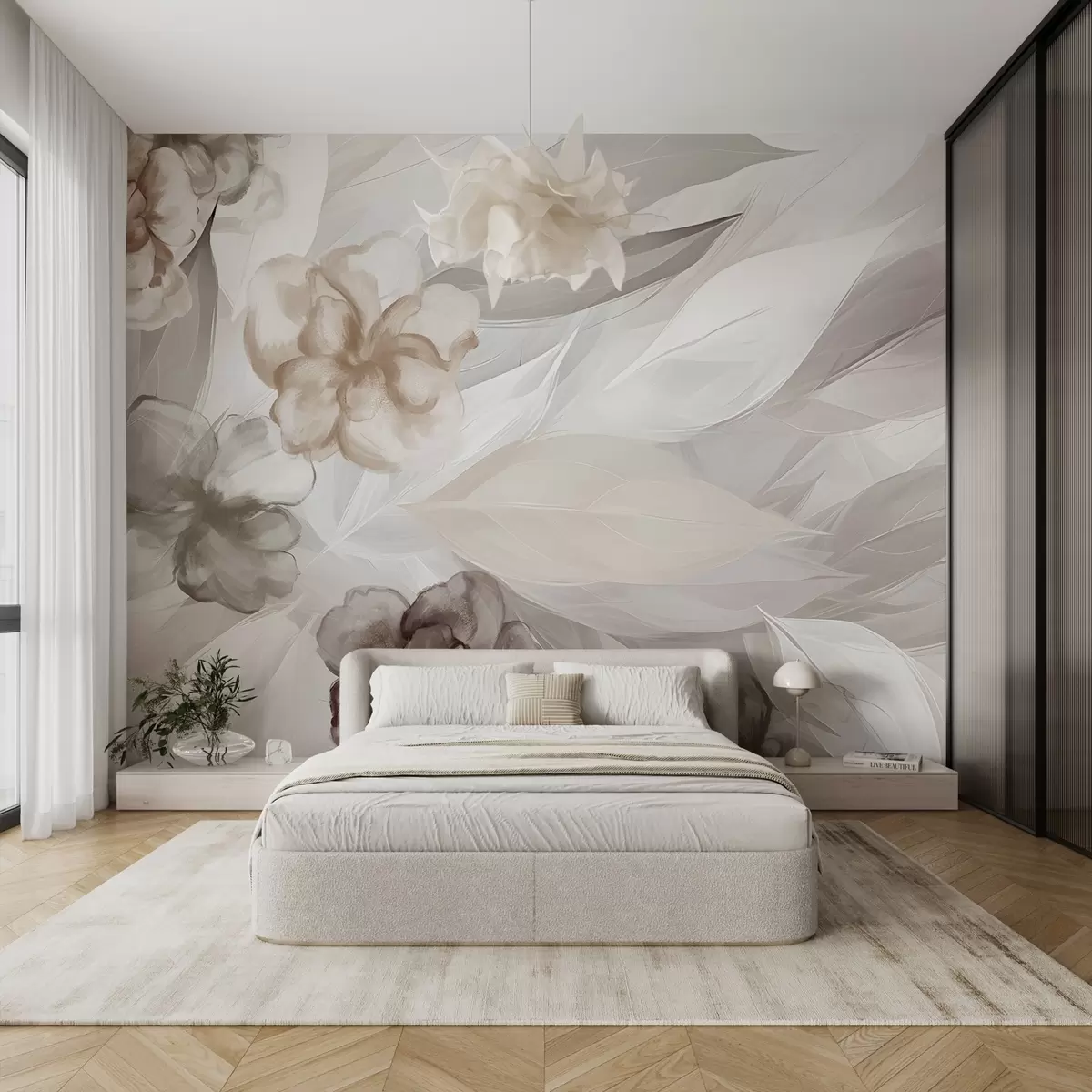Фототапет Деликатни цветя и листа в нюанси на бяло, кафяво и бежово флорален фон , меки цветове, нежни листенца Nr w09111v1