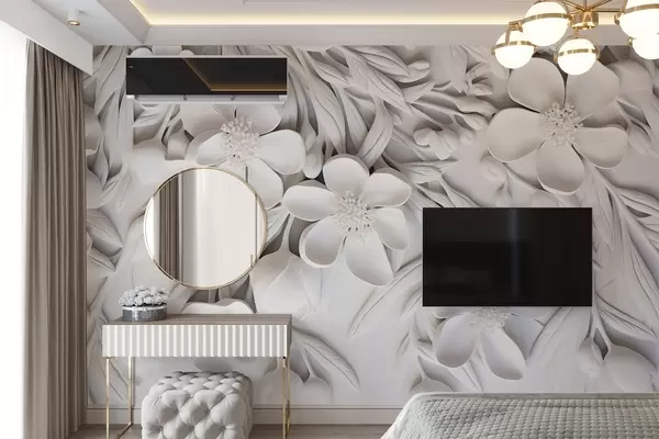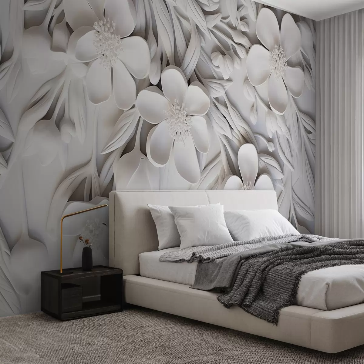 Фототапет Бели цветя и листа на бял фон, елегантни цветя, декоративен дизайн, сложни детайли Nr w09113