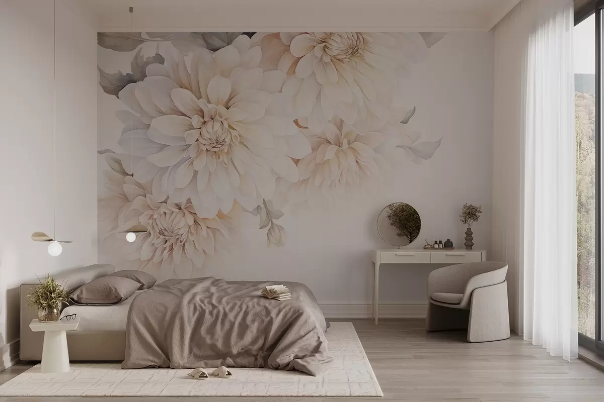 Фототапет Пастелни гергини с меки, деликатни прасковени и бели леки венчелистчета в акварелен стил, мек фон Nr w09115
