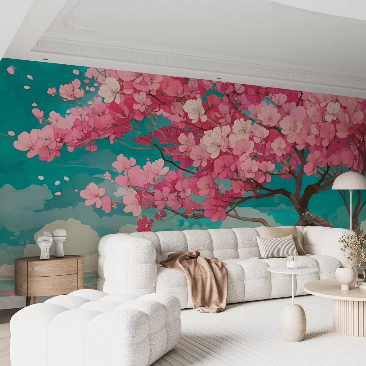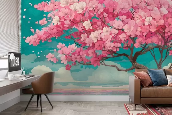 Фототапет Розово черешово дърво с падащи венчелистчета и синьо небе в романтичен стил Nr w09120