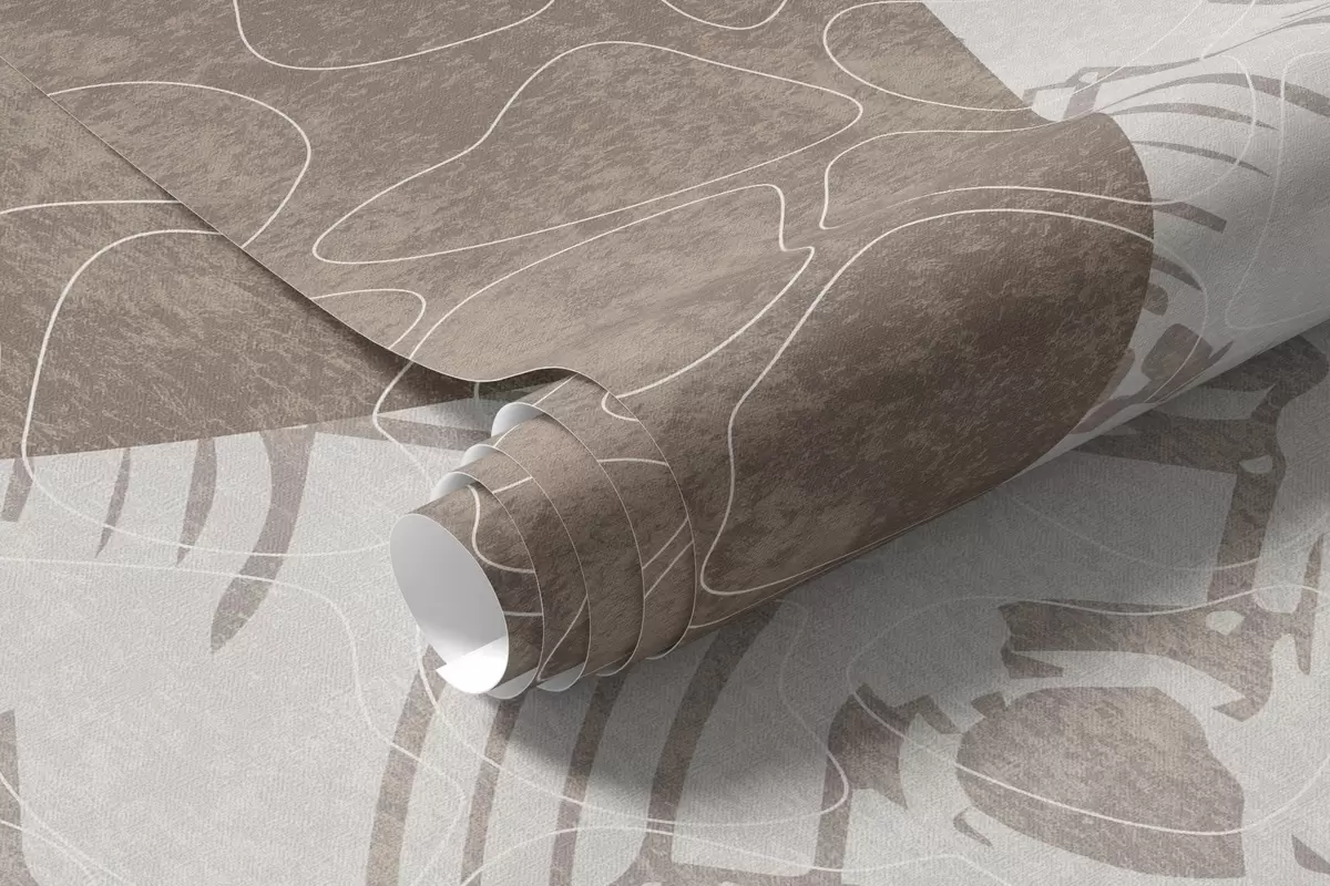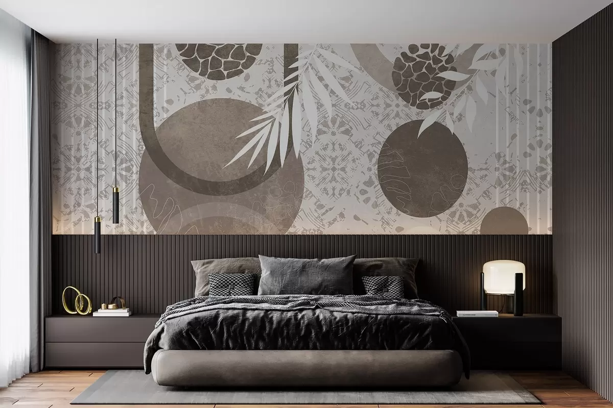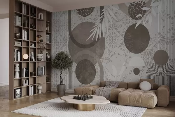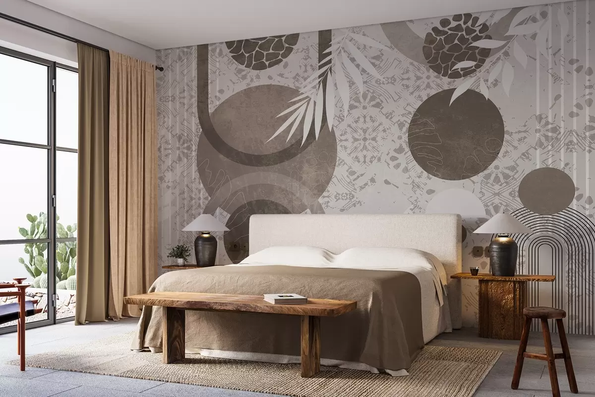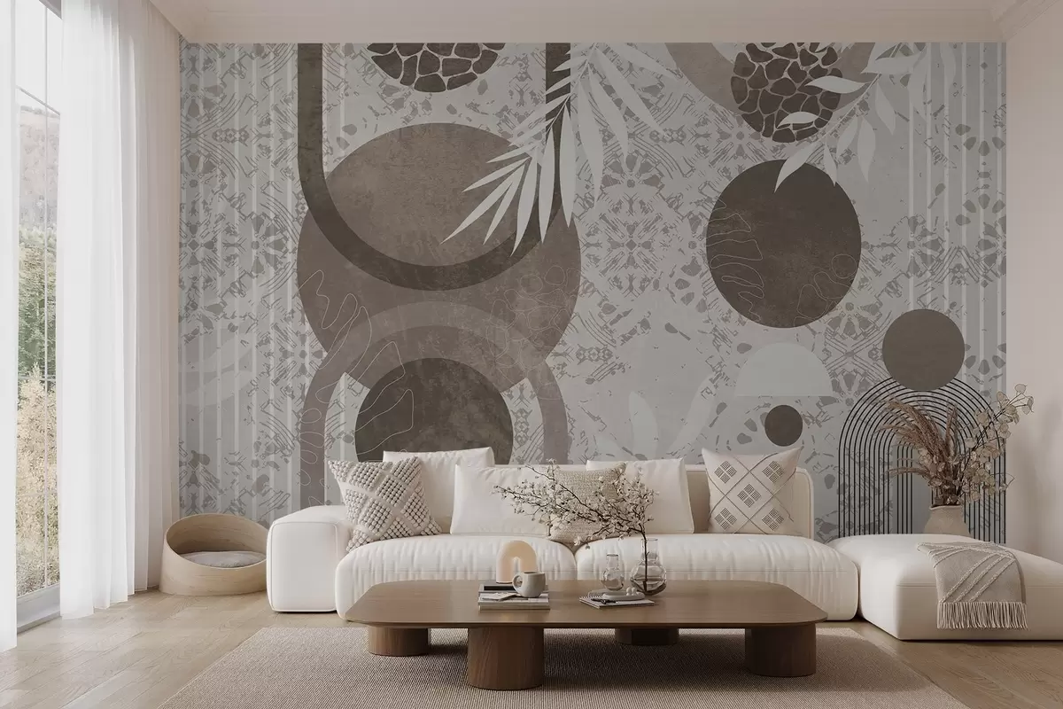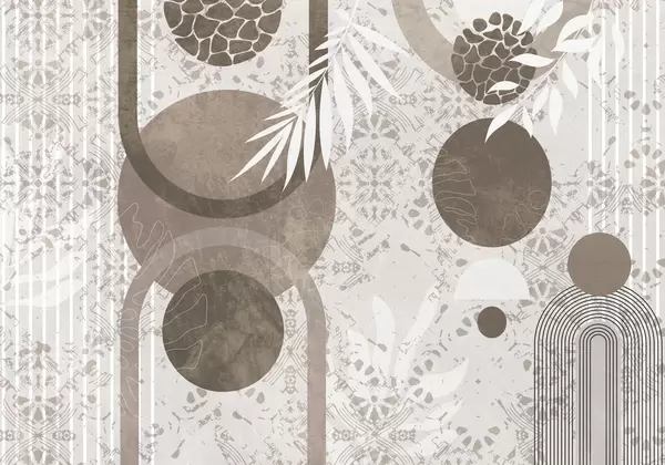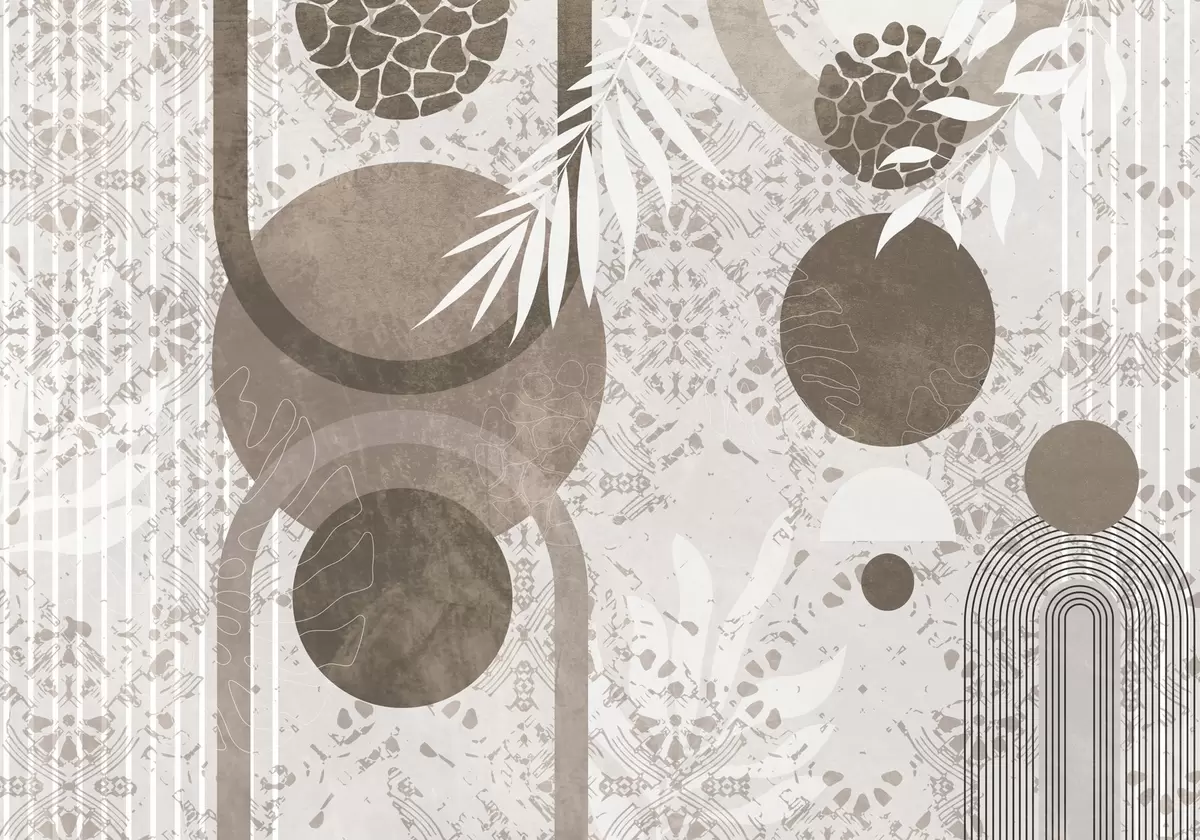 Фототапет Абстрактни текстурни геометрични форми в кафяво и бяло, кръгове, арки и ботанически елементи, модерен и минималистичен дизайн Nr w09130