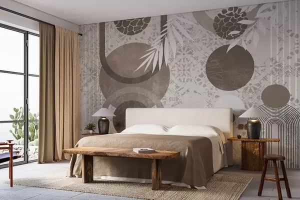 Фототапет Абстрактни текстурни геометрични форми в кафяво и бяло, кръгове, арки и ботанически елементи, модерен и минималистичен дизайн Nr w09130