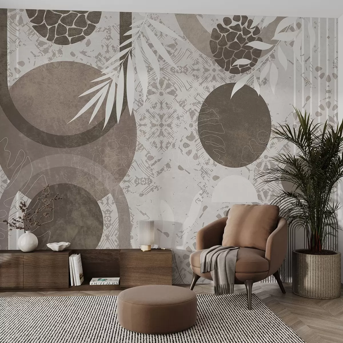 Фототапет Абстрактни текстурни геометрични форми в кафяво и бяло, кръгове, арки и ботанически елементи, модерен и минималистичен дизайн Nr w09130