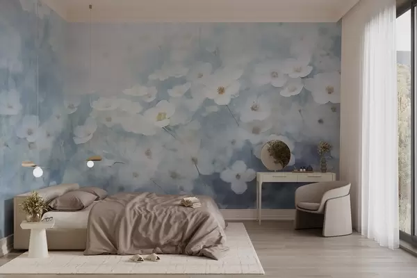 Фототапет Текстурно поле от бели цветя на анемония, мек фокус, мечтателна атмосфера, светлосиня и бяла цветова палитра, пролетна поляна Nr w09134