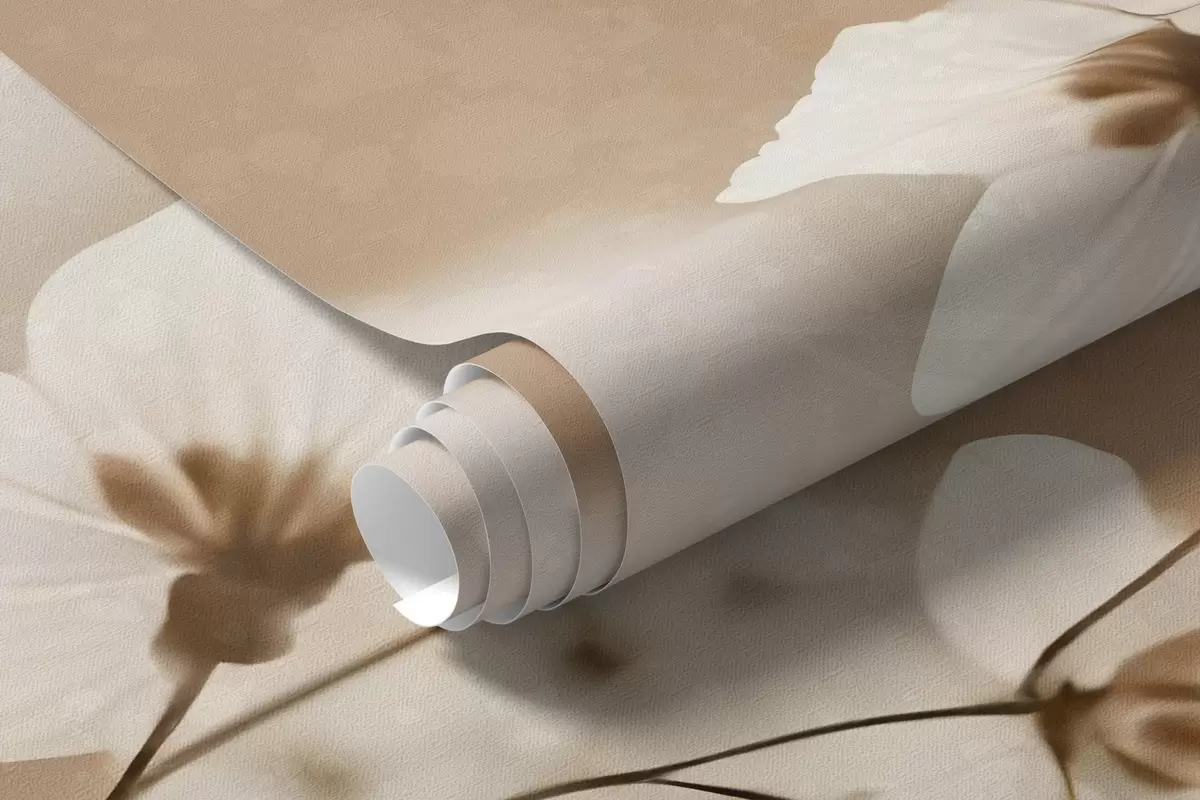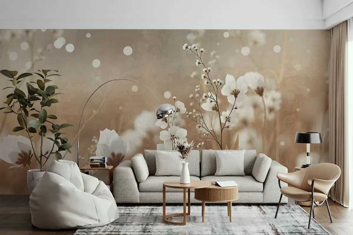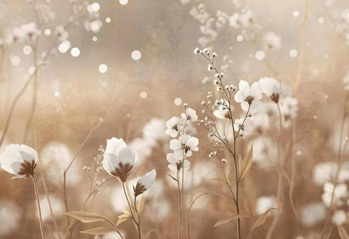 Фототапет Бели цветя с кафяви стъбла и листа в полето, боке ефект, топла цветова палитра, елегантно произведение на изкуството, вдъхновено от природата Nr w09135